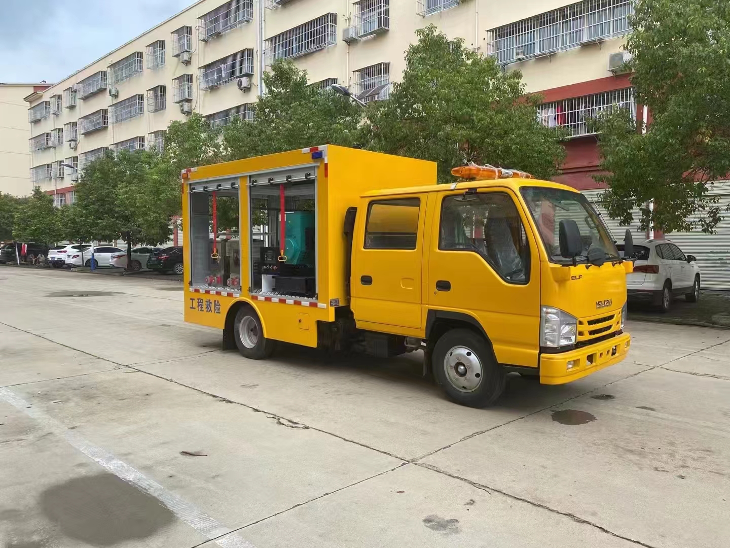 | 上裝配置 | 車箱一體式全封閉車箱車箱有隔音功能,廂體防火,阻燃,防雨,防塵,防銹,降噪,隔震,長期抗震結構,廂體外觀按照公告外觀制作,左右卷簾門,尾部是卷簾門,廂內(nèi)安裝LED作業(yè)燈,作業(yè)燈帶獨立開關,底板采用花紋板。配備康明斯50KW發(fā)電機組,2臺功率22KW便攜式超輕型高速潛水泵,單臺水泵流量可達500m³/h,單泵配40米排水管(20米/根),水管直徑 DN200mm,水管材質(zhì)為滌綸長絲編織。配有升降照明燈,升降燈可通過無線和有線遙控兩種方式控制,升降燈升降高度為1.2米,可水平旋轉。帶接地樁和接地電纜線,便攜泵控制柜,潛水泵浮圈,長排警燈,倒車影像,配兩只手提式干粉滅火器2只。其余為標配… | ||