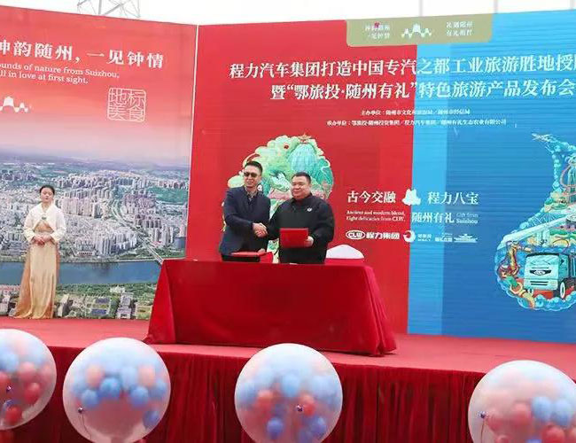 在程力工業(yè)旅游產(chǎn)品發(fā)布會上,程力汽車集團總經(jīng)理程阿羅(左)與鄂旅投總經(jīng)理王濤,簽署了文化旅游戰(zhàn)略合作框架協(xié)議,雙方?jīng)Q定利用各自的優(yōu)勢強強聯(lián)合,共同開發(fā)工業(yè)旅游潛在市場,為隨州的經(jīng)濟發(fā)展增添新的動能。