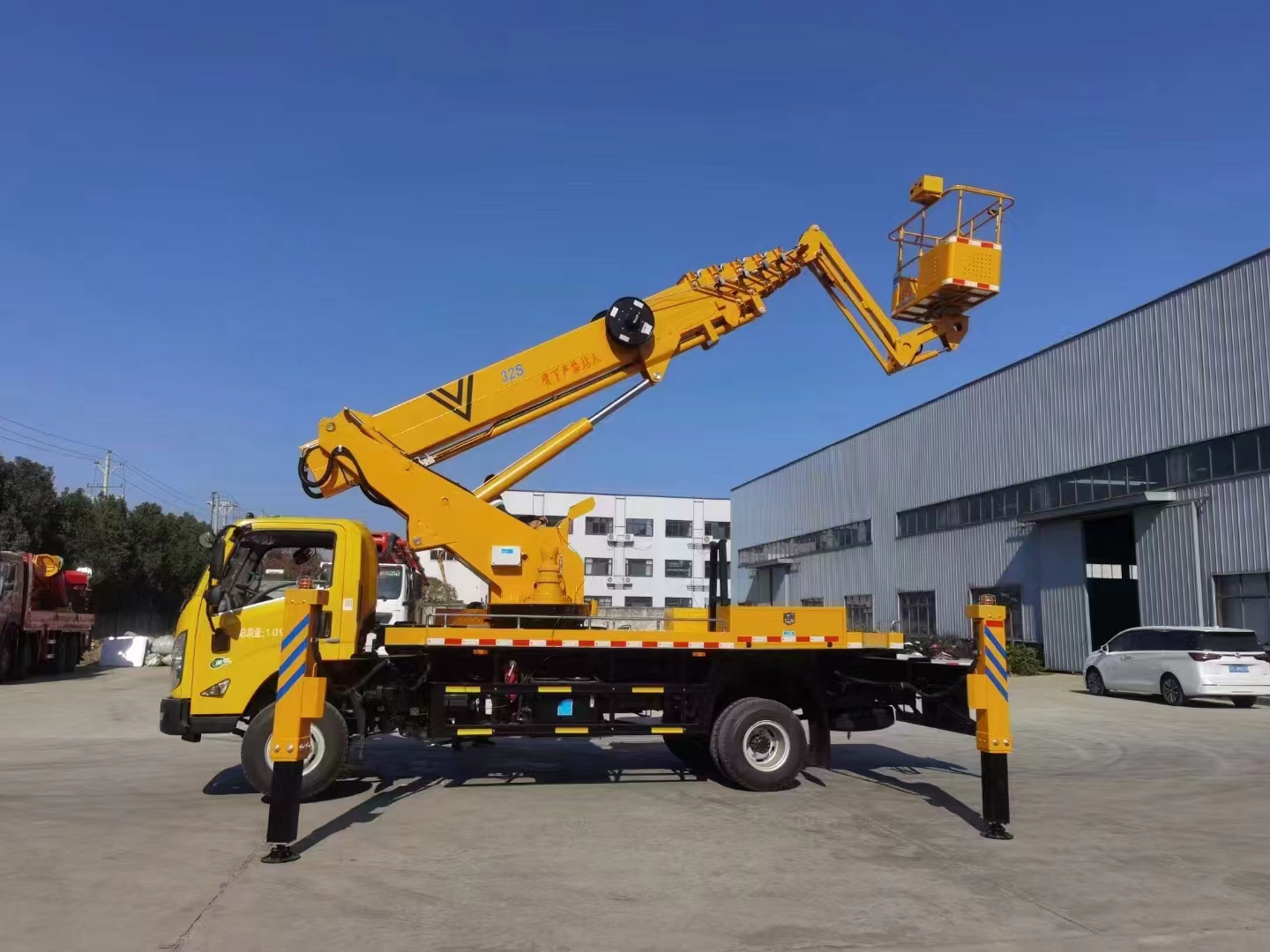 上裝配置 作業(yè)高度32米,帶小飛臂,六節(jié)六邊形同步伸縮工作臂,360度連續(xù)回轉(zhuǎn),配上下車自動互鎖裝置,水平檢測功能,支腿檢測功能,裝有應(yīng)急電動泵,電液比例控制系統(tǒng),實現(xiàn)無極調(diào)速,液壓自動調(diào)平。